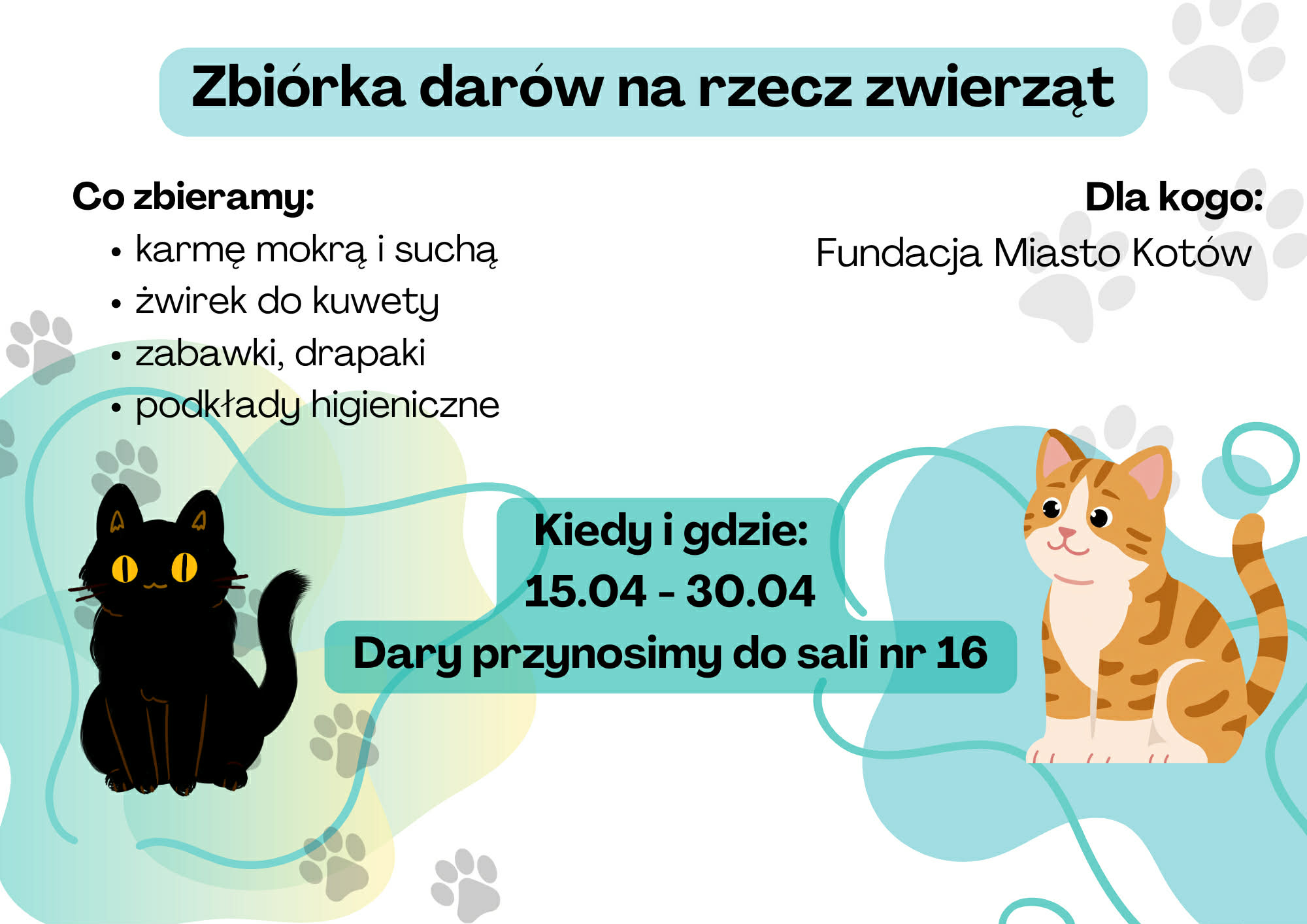 Akcja trwa od 15 do 30 kwietnia. Zbieramy: karmę, zabawki dla kotów, podkłady higieniczne, środki czystości. Dary można przynosić do sali nr 16 lub przekazać pani Iwonie Renosik i pani Krystynie Strzelczyk.